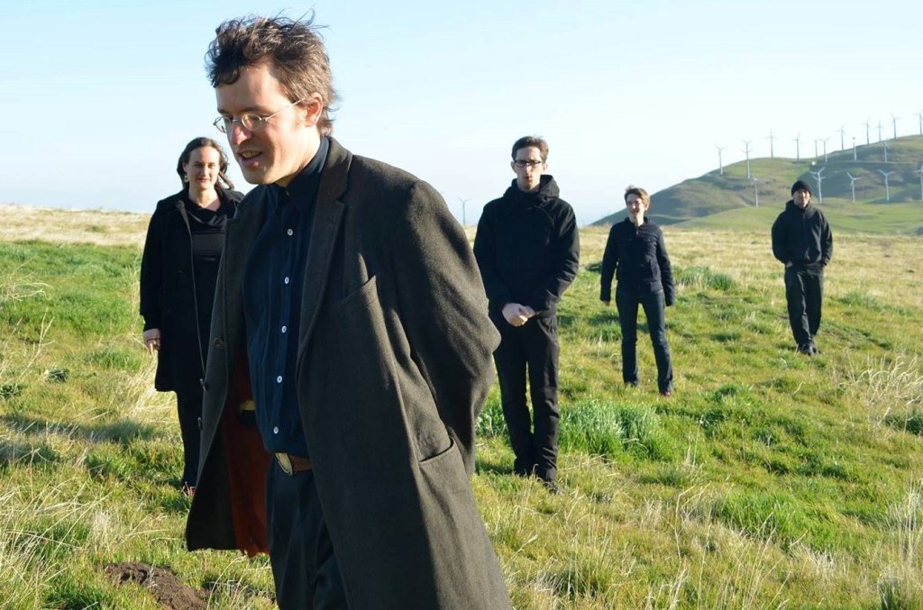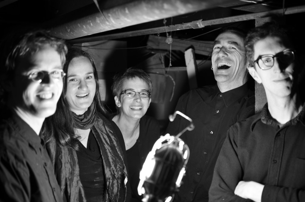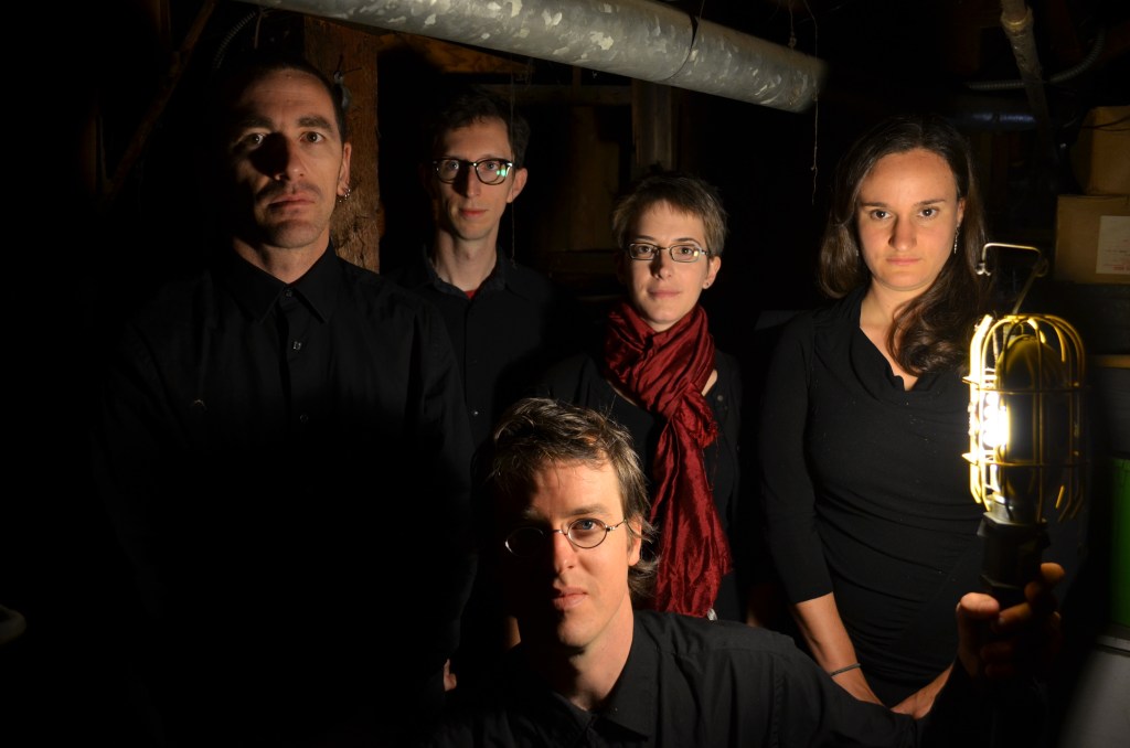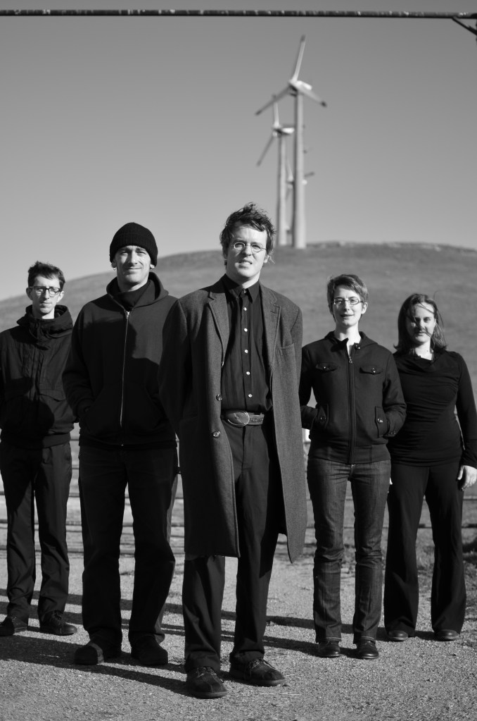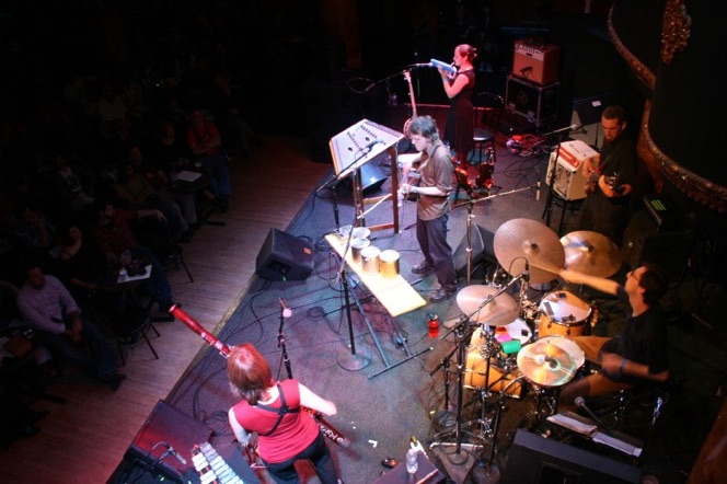 We also became more adept at orchestrating for the unique ensemble. I learned how to write for the main quintet (drums, bass, guitar, bassoon/voice, violin, guitar/hammer dulcimer/voice) in a way that sounded balanced, frequency-wise, and the others became more efficient at crafting parts that fit the styles we were working within. There was probably a decrease in trial and error, in radical experimentation as we went along, though that spirit inculcated at Mills never left us completely. It even seemed like we started internalizing each other’s tendencies—I found myself coming up with polyrhythmic ideas that seemed to come right from Jordan’s playbook, and it seemed like some of Jason’s lines took a contrapuntal turn that sometimes reminded me of things I’d written (to give just two examples off the top of my head, but this kind of inter-influence went in all directions among all five of us).