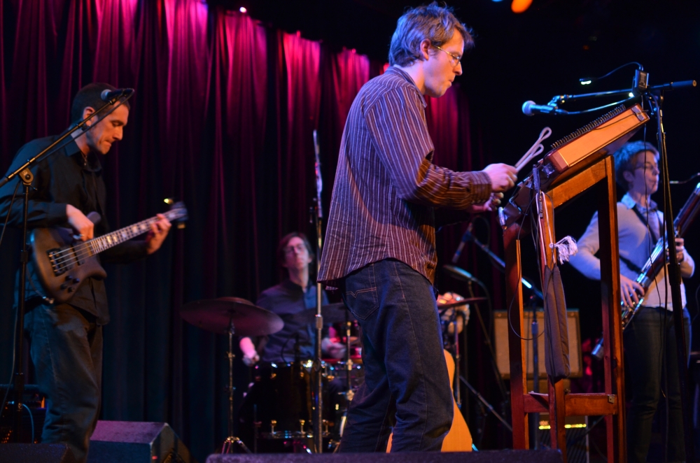 The main quintet worked together, rehearsing twice a week, for almost a decade. We started out idealistically I suppose with regard to sound, taking every finicky instrument, each with its own unique mic’ing requirements, into any noisy bar we were playing—melodica, flutes, whistles, vibraphone, banjo, music boxes, even wine glasses, on top of the usual drums, bass, bassoon, guitars, violins, and hammer dulcimer. You can imagine how that went. Eventually we started paring down to the instruments that we could get to sound reasonable consistent through different systems, eliminating variables and bringing more control to our side of the performance through the use of pedals and, for a while, our own devoted sound person.